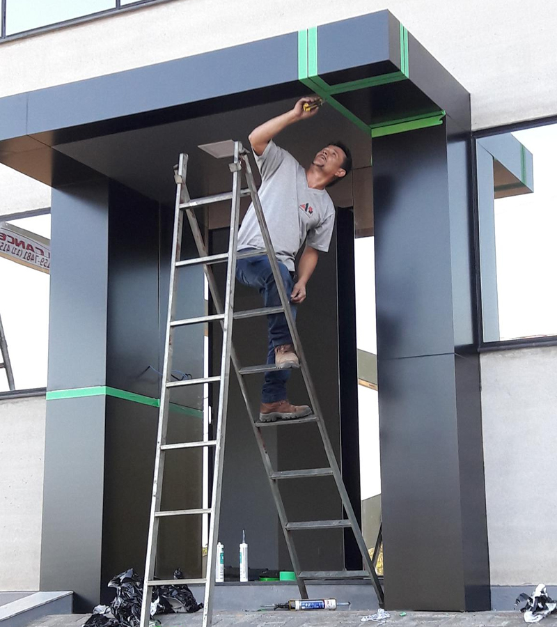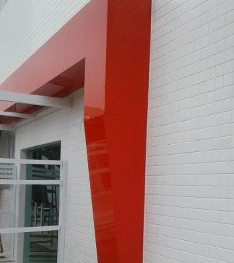 • Pórticos e entradas de lojas e edifícios em alumínio, com personalização em vinil ou impressão direta